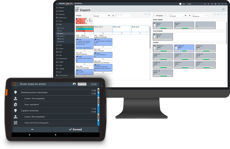 E-Dispatch verdeelt opdrachten automatisch over voertuigen en teams, rekening houdend met capaciteit, beschikbaarheid en rij- en rusttijden.